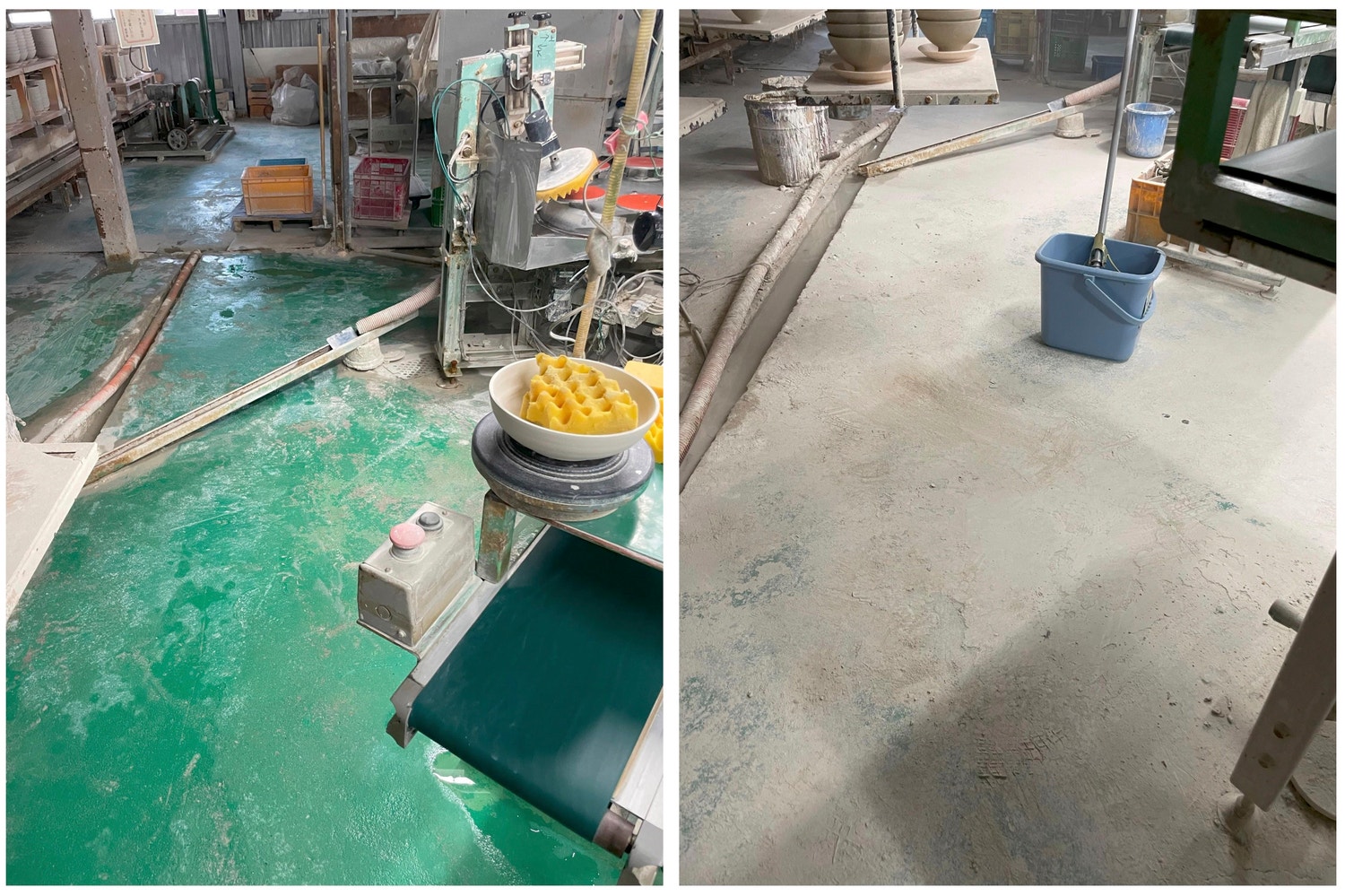 毎日掃除が習慣化し、維持されている現場の床(左:改善後 右:改善前)