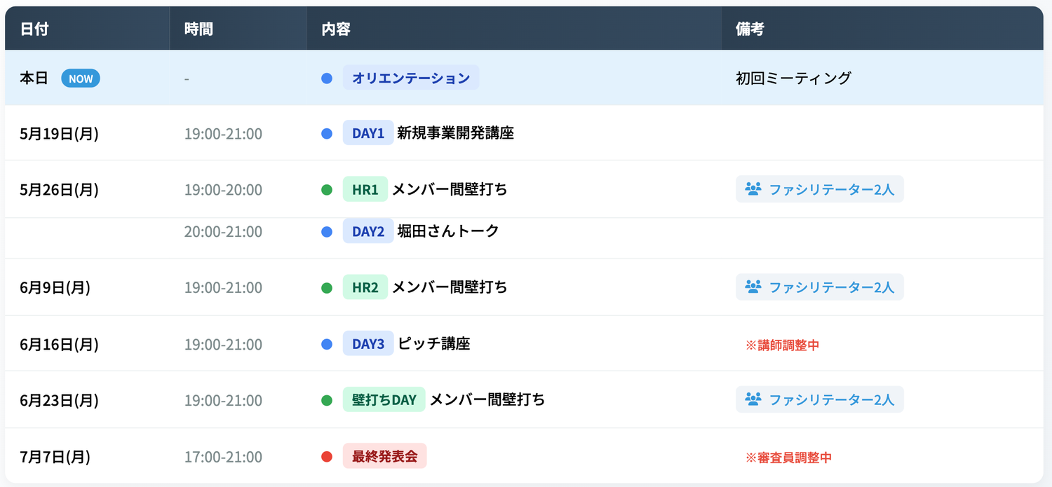 ピッチ完成までの約3か月間、講師を招いた特別講座やスライドデザインセミナー動画の視聴、メンタリングほか伴走支援を行います。